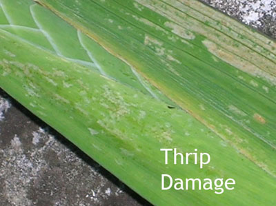 Plants severely infested with gladiolus thrips have a spotted, bleached appearance
