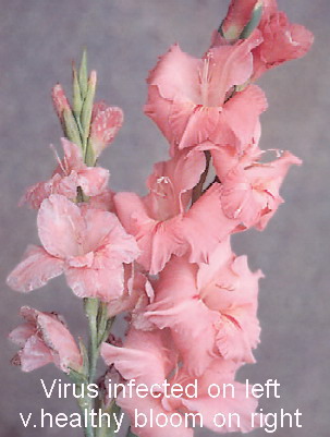 Some viruses cause cause curling of poor small spikes, small corms and poor root