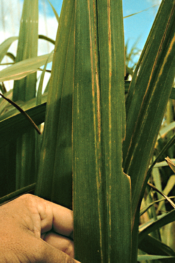 - Longitudinal chlorotic stripes on leaves, turning brown and necrotic, leading to leaf drying from tip downwards
