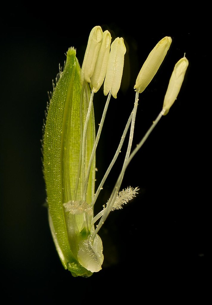 Rice is a monocarpic annual plant, that grows to a height of 1 – 1.8 m, depending on the variety and soil fertility. The grass has long, slender leaves 50 – 100 cm long and 2 – 2.5 cm broad. The wind pollinated flowers are produced as a branched arching to pendulous inflorescence, 30 – 50 cm long. Each panicle has 50 to 300 flowers (floret or spikelet), which later form the grains. The seed is a grain (caryopsis) 5 – 12 mm long and 2 – 3 mm thick.