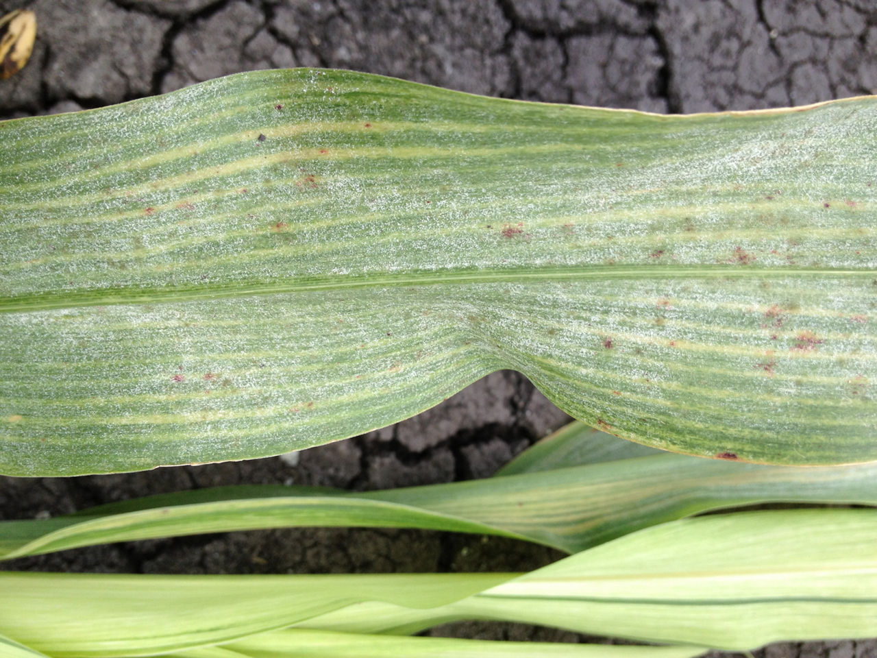 • Subsequent leaves show progressively more of a complete bleaching of the leaf tissue in streaks or stripes.