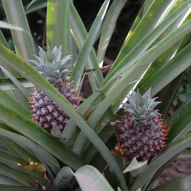 This fruit is native to southern Brazil and Paraguay where its wild relatives occur. Portuguese had introduced the pineapple to India and Java, and the fruit, delighted with the climate that so closely mirrored its conditions of origin, spread throughout the Far East. The Indians carried it to the West Indies before Columbus arrived. In 1493 Columbus found the fruit on the island of Guadeloupe and carried it back to Spain and it was spread around the world on sailing ships that carried it for protection against scurvy. The Spanish introduced it into the Philippines and may have taken it to Hawaii and Guam early in the 16th Century. The pineapple reached England in 1660 and began to be grown in greenhouses for its fruit around 1720.