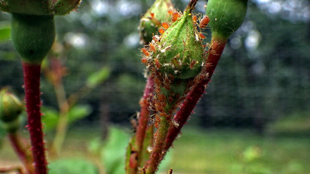 • Rose aphid: Macrosiphum rosaeformis D.M. rosae Elongated pear shaped pinkish body with large red eyes and black cornicles