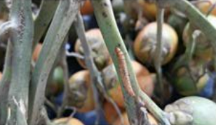 - Yellowing of spadices and presence of small holes with frass and drying on the spathe.