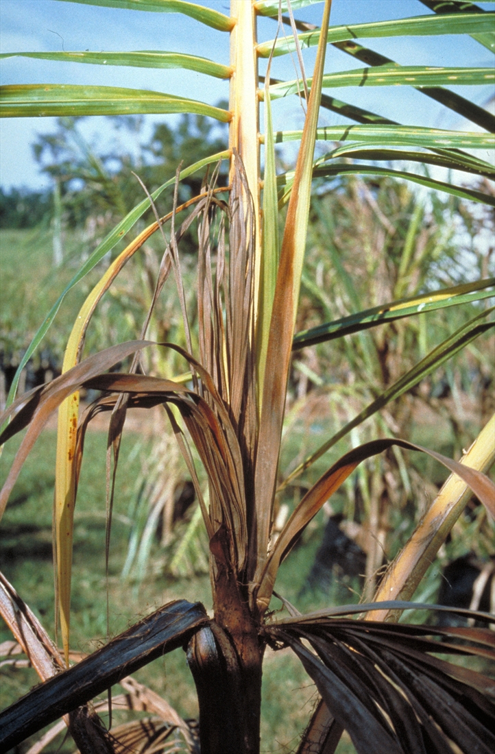 • The rotting slowly progresses downwards, finally affecting the meristem and killing the palms. This is accompanied by drooping of successive leaves. Nuts that are retained on the palm may grow to maturity.