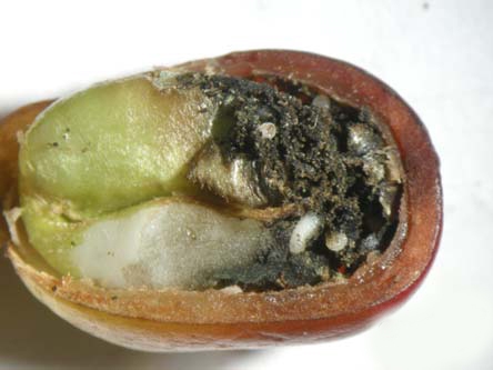 • The female beetle bores into the berries through the navel region and makes tunnels in the hard bean and lays eggs.