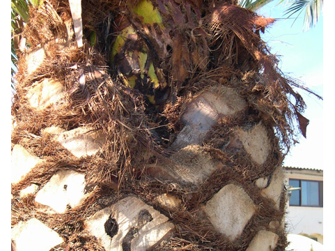 - Some holes in the crown or trunk from which chewed-up fibres with fermented odor are ejected. This may be accompanied by the oozing of brown viscous liquid .