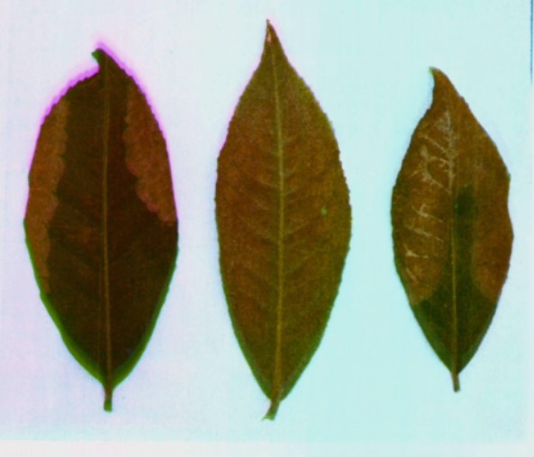 - Chlorotic leaves turn to red and then develop spotted necrosis
