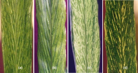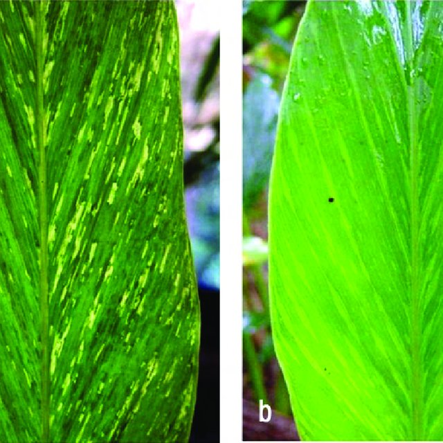 - Discontinuous stripes of light green colour running almost parallel to each other from the mid-rib to the margin of the leaves, which form a mosaic pattern.
