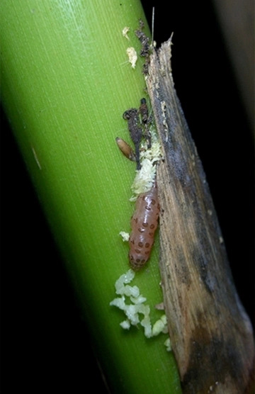 - At the early stage of the crop, the caterpillars of this yellow-coloured moth borer into the core of the aerial stem resulting in the death of central spindle, which appears as characteristic dead hearts.