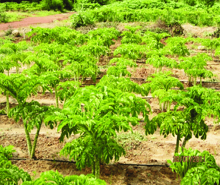 Elephant foot yam is a remunerative and profitable stem tuber crop. The crop is gaining popularity due to its shade tolerance, easiness in cultivation, high productivity, less incidence of pests and diseases, steady demand and reasonably good price. Tubers are mainly used as vegetable after thorough cooking. Chips are made of starch-rich tubers. Tender stem and leaves are also used for vegetable purpose. Tubers contain 18.0% starch, 1-5% protein and up to 2 % fat. Leaves contain 2-3 % protein, 3 % carbohydrates and 4-7 % crude fibre. Cultivating of elephant foot yam is limited to India, Philippines, Sri Lanka and South East Asia.
