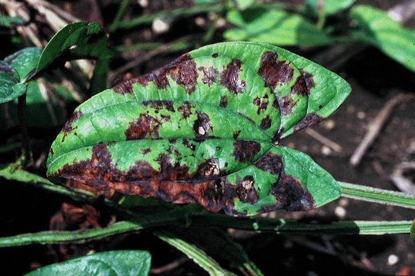 - Dark sunken spots observed on leaves, stems, and other parts of the plant.