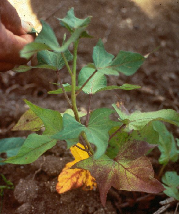 • Yellowing, wilting and drying up of oldest leaves, and purple veins on young leaves are common symptoms