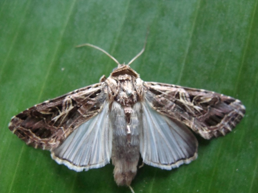 - Greenish larva with white lines and black crescents on thorax is seen.