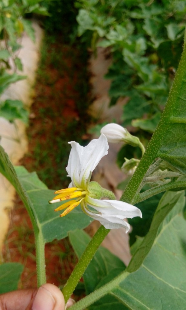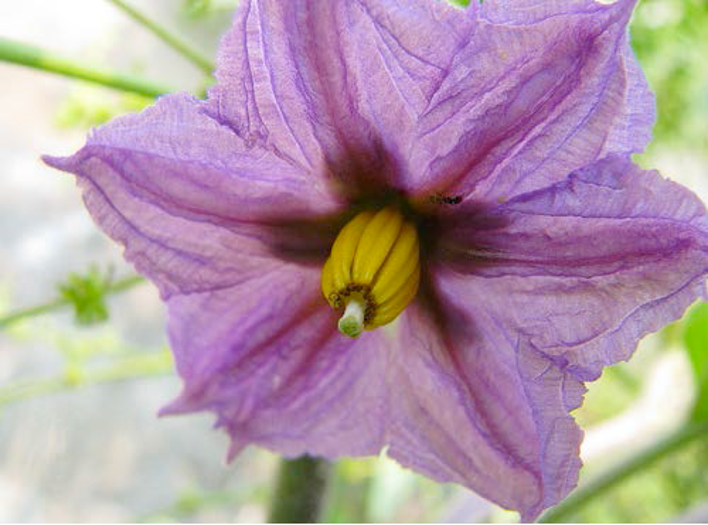 Brinjal is an erect annual plant, often spiny, with large, coarsely lobed fuzzy leaves, 10-20 cm long and 5-10 cm broad. The plants usually grow 45 to 60 cm high and bears long to oval shaped, purple or greenish fruits. Flowers are white to purple, with five-lobed corolla and yellow stamens. The fruit is a fleshy berry, containing numerous small, soft seeds.