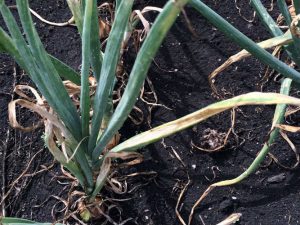• The disease appears as dark green to almost black smudge (stroma of the fungus) on the bulb, neck or green leaves that are clinging to bulbs.