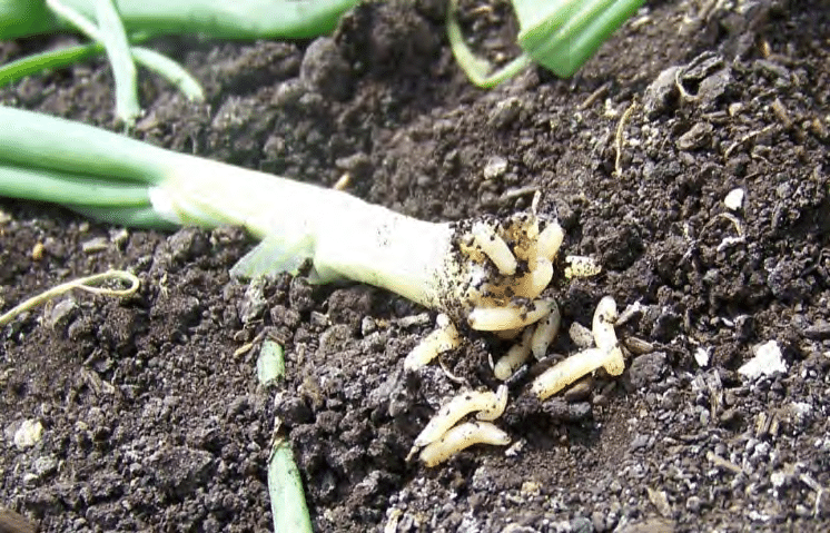 - The flies lay their eggs on old leaves or on soil and larva enters into soil and damage disc portion of onion bulb.