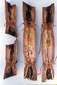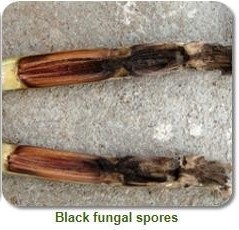 - The soil-borne fungus enters through the cut ends, causing pink or reddish discoloration near the cuts.