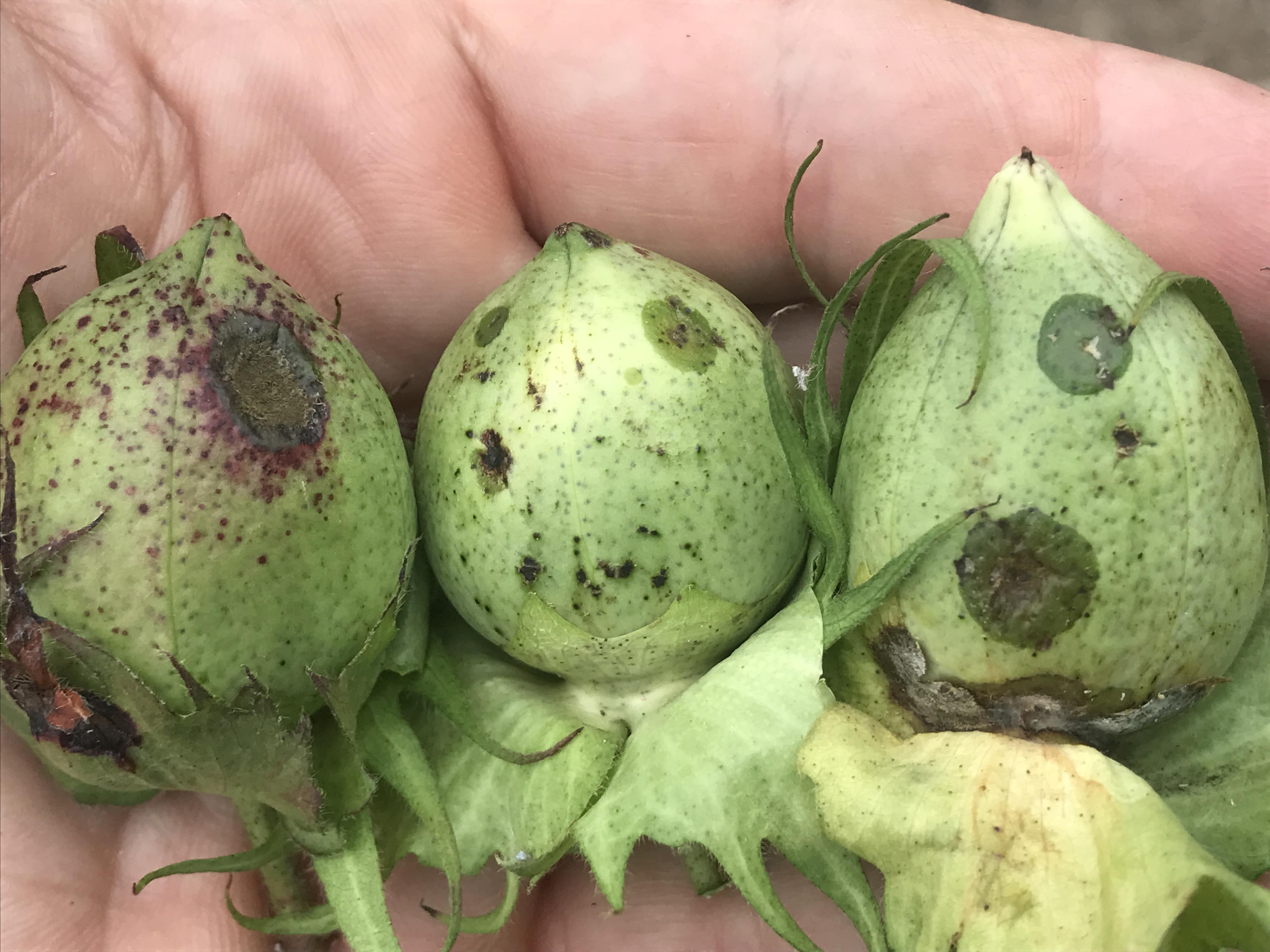 - Infected bolls develop small, water-soaked, circular, slightly sunken, reddish-brown spots.