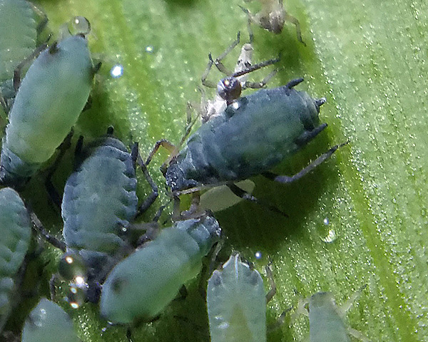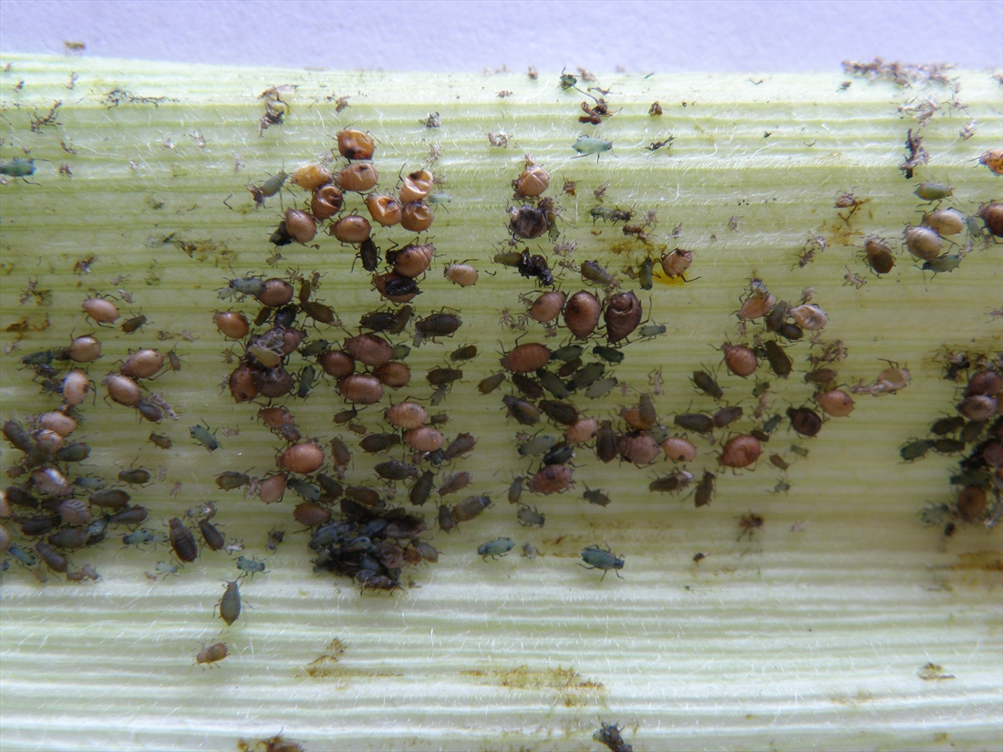 - The aphid colony may sometimes cover completely the emerging tassels and the surrounding leaves preventing the emergence.