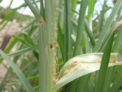 Larvae enters into stem & feeds on internal tissue which causes dead heart