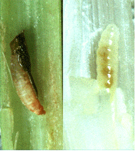 - The attack results in formation of a hollow cavity or tubular goal like onion leaf at the base of the infested tiller.