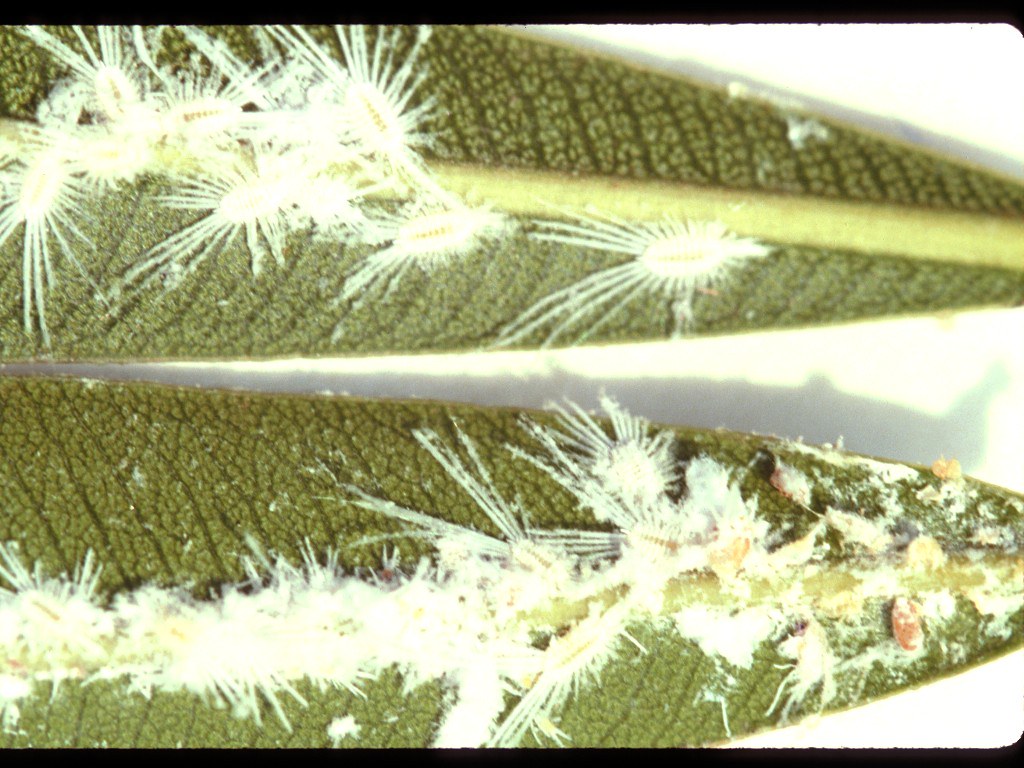 - The adult bugs are covered with whitish powder and colonize between bark of tree trunk, young shoots and panicles.
