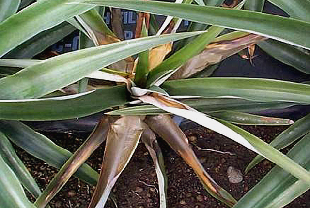 - Water-soaked lesions on the white basal sections of leaves in the central whorl