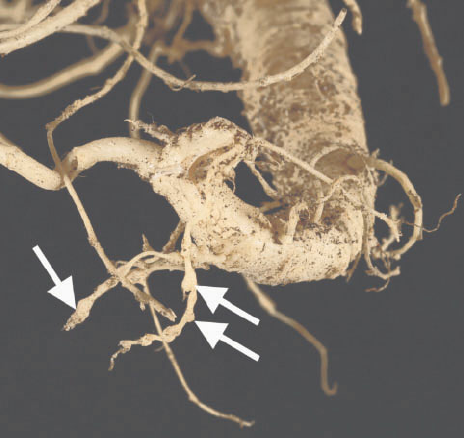 - Roots branch profusely starting from the gall tissue causing a ‘beard root’ symptom