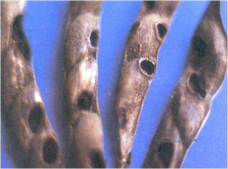 - Larvae makes round holes on pods
