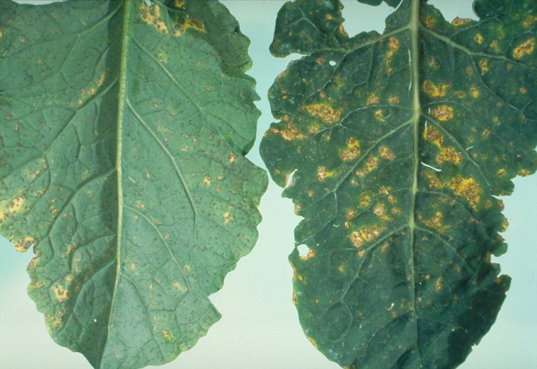 - The first symptom observed are small, light green-yellow lesions on the upper leaf surface, later showing on the undersurface.