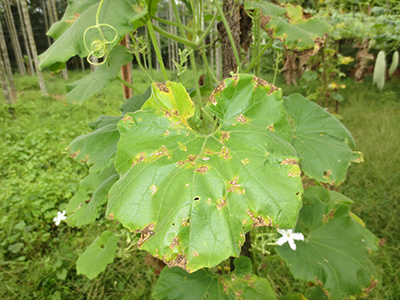 • The primary symptoms are pale yellow angular spots on the upper surface of the leaves.