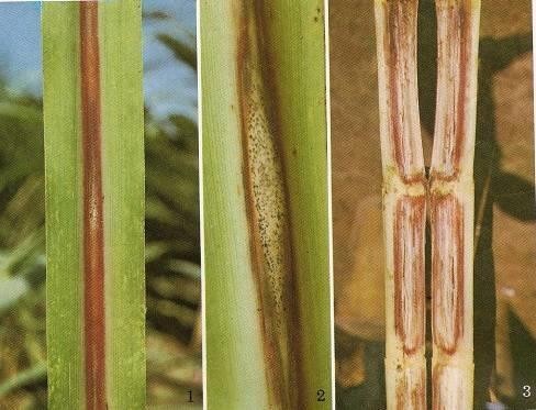 • The most characteristic symptom of the disease is the drying up of the canes, which when split open will show characteristic red colouration of the internal tissues with horizontal white patches and the typical foul smell.