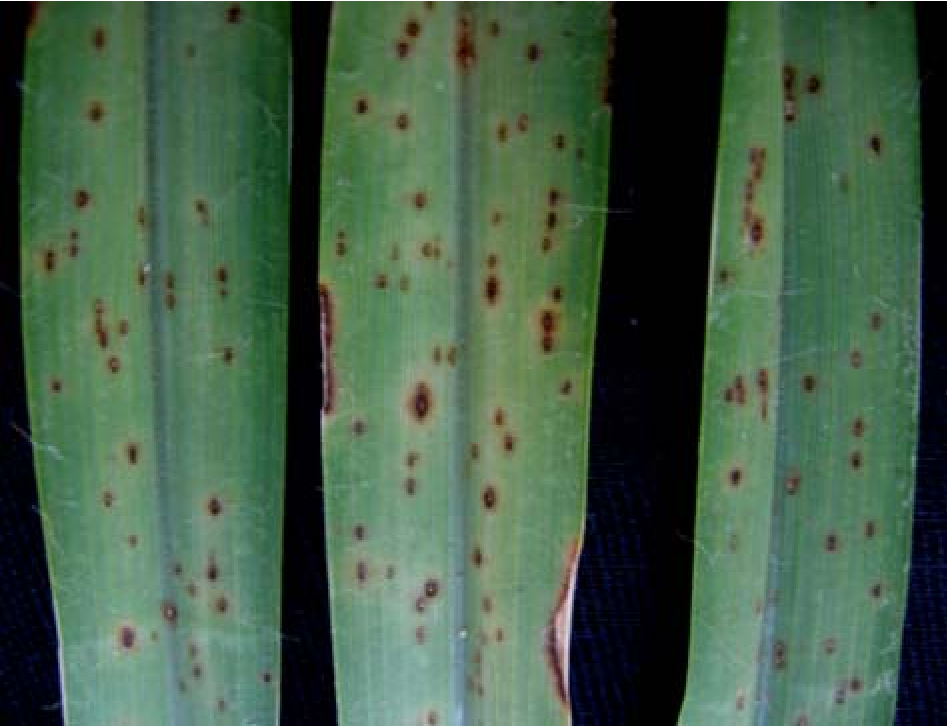 • Development of small dark lesions are noticed on leaves which are usually oval in shape and centers of lesions are grey in color.