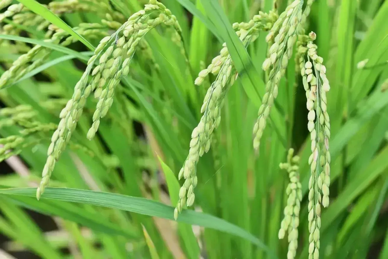 Rice is a monocarpic annual plant, that grows to a height of 1 – 1.8 m, depending on the variety and soil fertility. The grass has long, slender leaves 50 – 100 cm long and 2 – 2.5 cm broad. The wind pollinated flowers are produced as a branched arching to pendulous inflorescence, 30 – 50 cm long. Each panicle has 50 to 300 flowers (floret or spikelet), which later form the grains. The seed is a grain (caryopsis) 5 – 12 mm long and 2 – 3 mm thick.