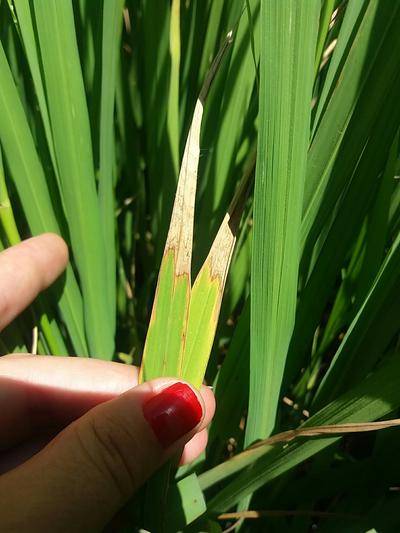- Newly developed lesions on the tips or edges of leaf lamina, are approximately 1-2 cm² in area with a grey-green, water-soaked appearance.