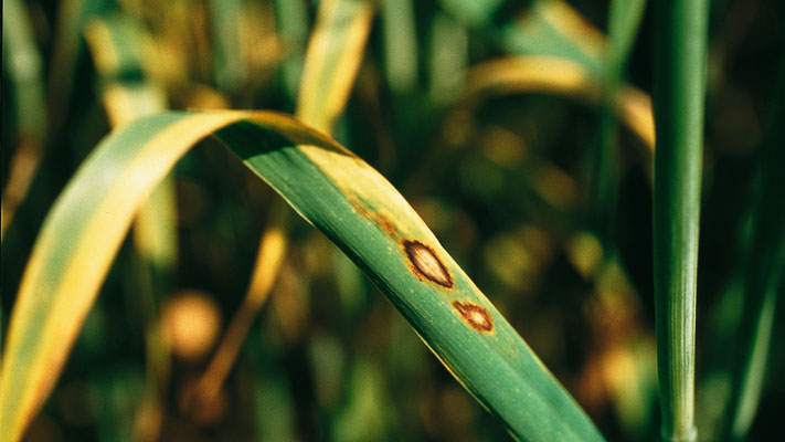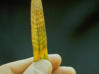 - Other symptoms include leaf tip blight (lesions without zonations), leaf blight (reddish-brown spots without necrosis), seedling blight (coleoptile decay with red-brown discoloration and root rot), leaf sheath browning (large areas of brown lesions without necrosis) and head blight (flower deformation and sterility with a light-brown discoloration of the glumes).