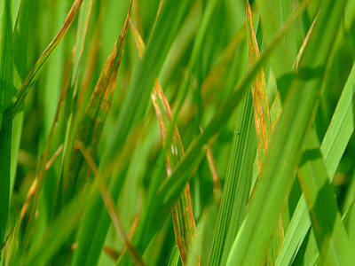 - Towards the later phase of the disease, the entire leaves turn yellow in colour which closely resembles the symptoms of bacterial leaf blight.