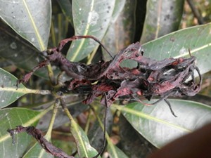 - This may be accompanied by exudation of yellowish-brown gum from the infected twigs and branches.