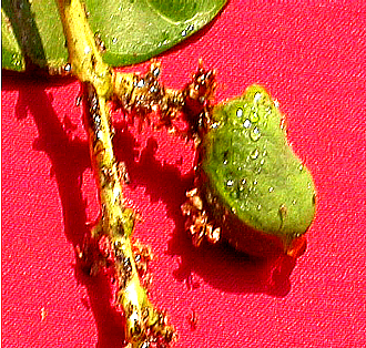 - Attack is on tender new leaves encircling inflorescence.