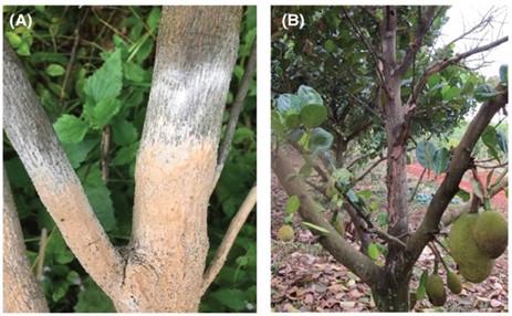 - Young woody branches of the affected trees lose their leaves and show die back symptoms.