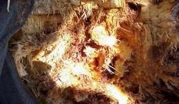 - Some holes in the crown or trunk from which chewed-up fibres with fermented odor are ejected. This may be accompanied by the oozing of brown viscous liquid .