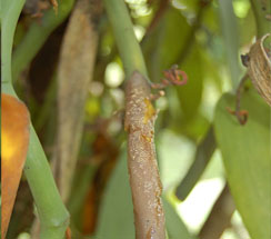 • Yellowing of leaves, stem and leaves becoming flaccid, shriveled and giving a drooping appearance.
