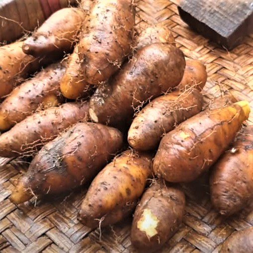 Lesser Yam or Dioscorea esculenta is a perennial, climbing plant with a tuberous rootstock. It has spines and it can climb up to about 2.4 m high and spread up to 1.8 m across. The leaves are often heart-shaped It is often cultivated as root crop in tropical areas in East Asia. Though some varieties can be poisonous, most are edible. The tuber has a yellow or white flesh. It is cooked and used as vegetable. It has a sweet and pleasant flavour similar to that of sweet potato or chestnuts.