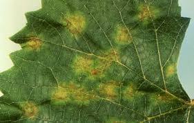 - White/ yellow/ orange fungal growth appears on the lower surface of the leaves, under conditions of high humidity.