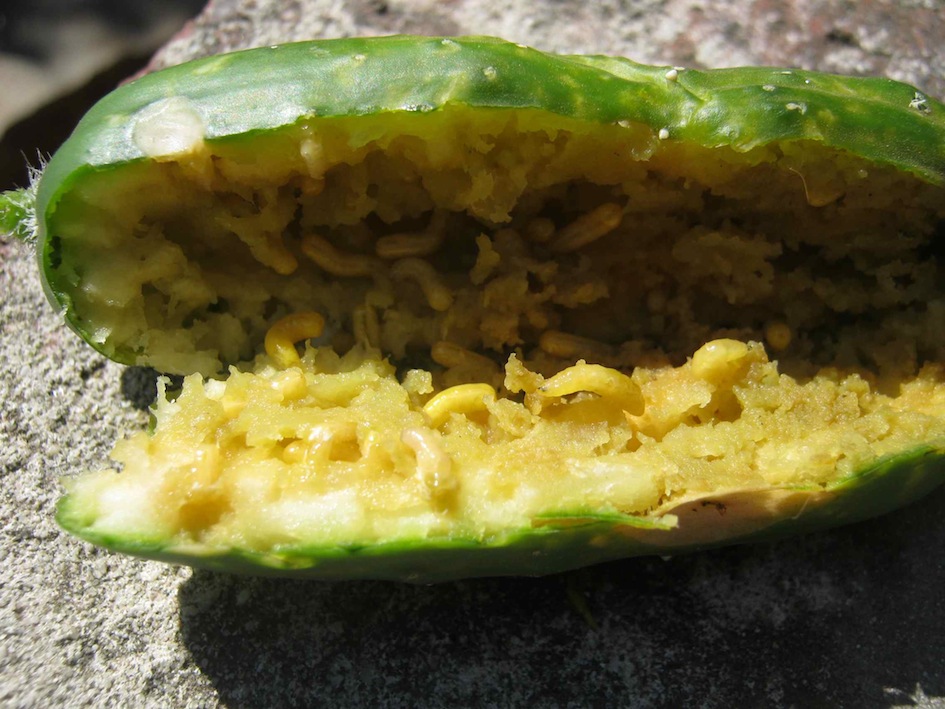 • Older fruits show less symptoms, but on split opening, a mass of maggots in pulp is found
