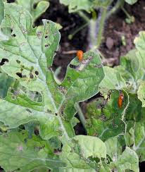 - Adult beetles feed the leaves and flowers. The attacked leaf shows holes.