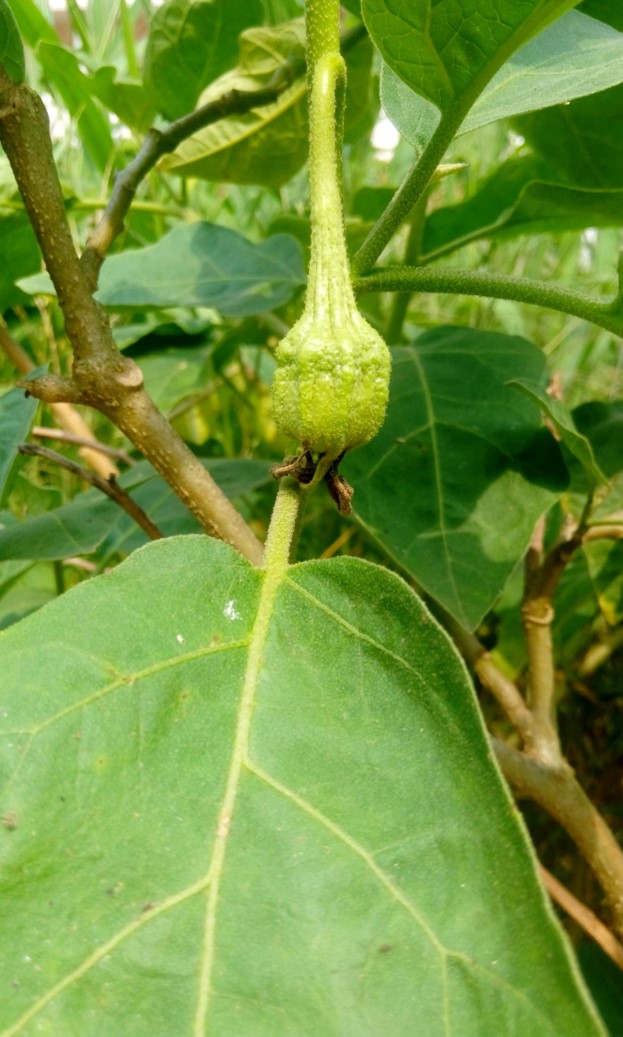 Brinjal is an erect annual plant, often spiny, with large, coarsely lobed fuzzy leaves, 10-20 cm long and 5-10 cm broad. The plants usually grow 45 to 60 cm high and bears long to oval shaped, purple or greenish fruits. Flowers are white to purple, with five-lobed corolla and yellow stamens. The fruit is a fleshy berry, containing numerous small, soft seeds.