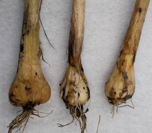 - Symptoms are stunted growth, discoloration of bulbs, and swollen stems.