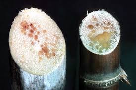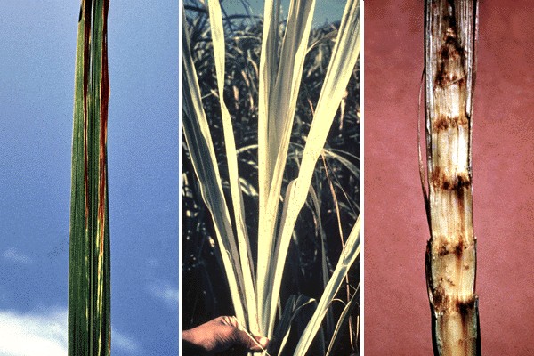 - Infected canes exhibit stunted growth, short internodes, and bushy appearance, with bacterial ooze and rotten pockets visible when cut open